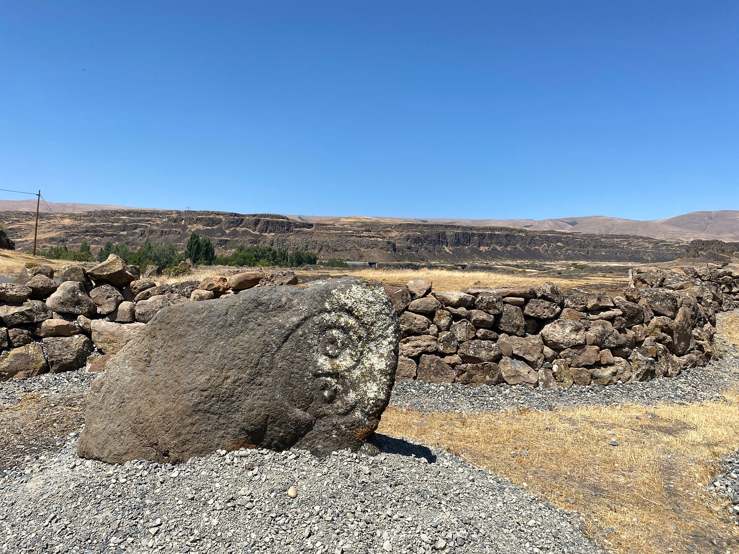 Another site, just off Highway 14 on the Washington side of the river,r there is an outdoor museum, of sorts, that tells another story about the apocalypse. They are historic petroglyphs that were originally on Columbia River rimrock serving as guideposts for Indigenous travelers in the region. They were moved before their original placements were flooded by The Dalles Dam.